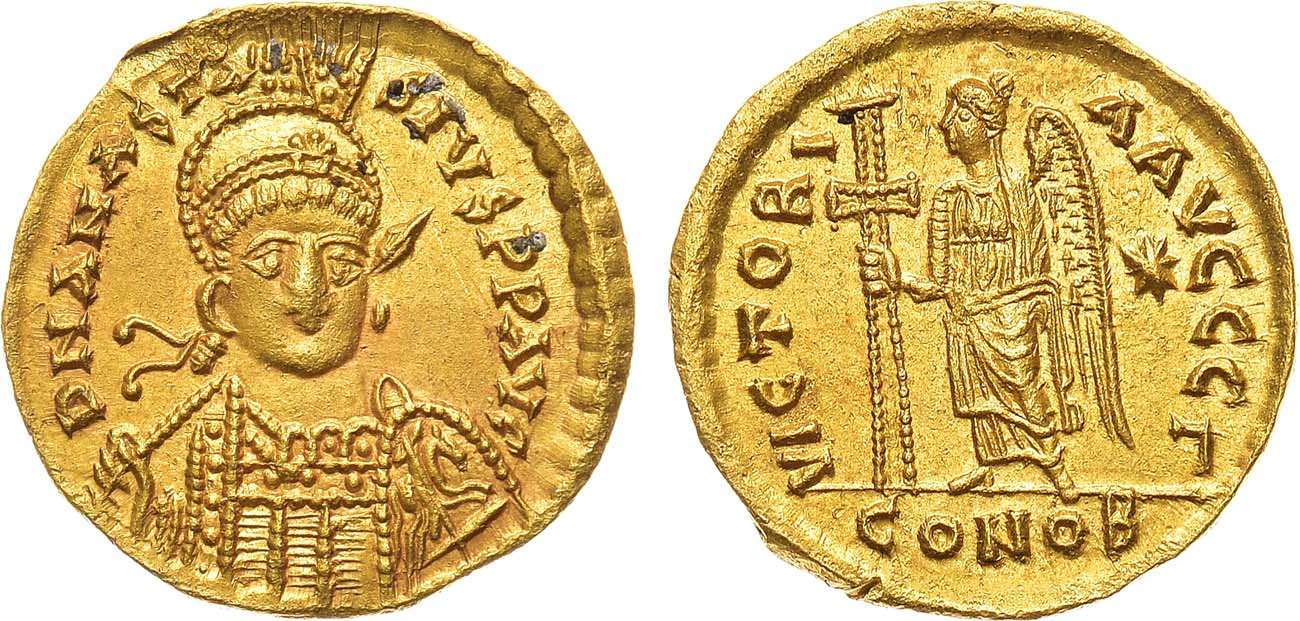 Золото. 4,47г. Константинополь. Аверс: круговая легенда "DN ANASTA-SIVS PP AVG"; портрет императора анфас в доспехах и шлеме, с копьём на правом плече. Реверс: круговая легенда "VICTORI-A-AVCCCГ"; изображение Ангела влево с крестом в правой руке; под линией обреза "CONOB". Sear 3. AU.
