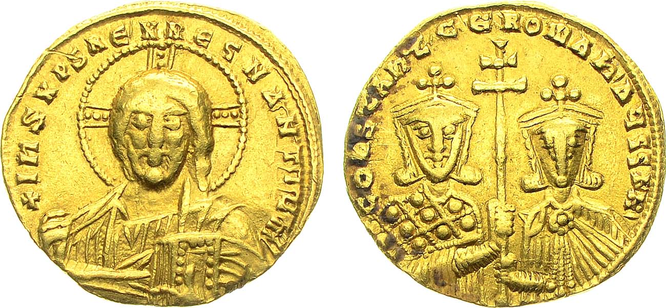 Золото. 4,38г. Константинополь. Аверс: "+IhS XPS REX REГNANTIЧN" бюст Иисуса, нимб с крестом, в руках Евангелие. Реверс: "COПSTAПT' ET ROMAh'AЧГГ b' " двойной поясной портрет Константина VII слева и Романа II справа, между ними большой крест. Sear 1751. Sommer 36.9. XF.