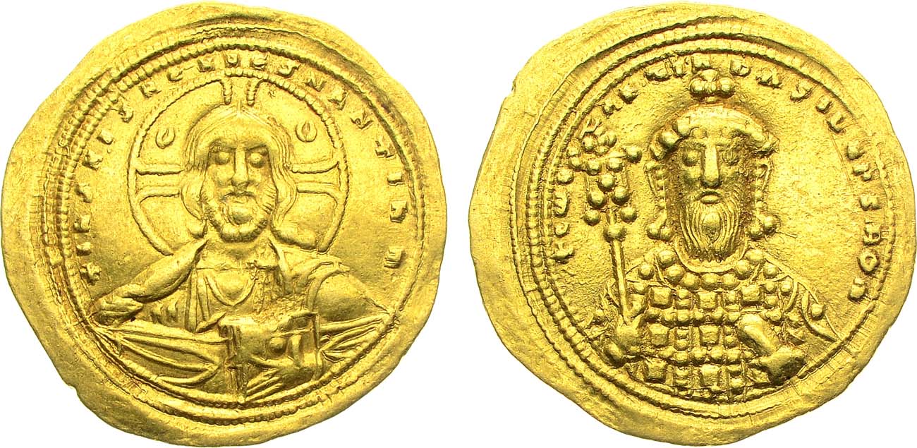 Золото. 4,41г. Константинополь. Аверс: круговая легенда "+IhS XIS REX REГNANTIhM"; изображение Христа с поднятой правой рукой и Евангелием - в левой. Реверс: круговая легенда "CWПSTAhTIh bASILEЧS ROM"; изображение императора с лабарумом и акакией Sear 1815. Sommer 42.1. AU.