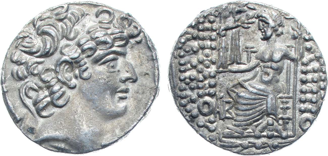 Серебро. 15,68г. Аверс: голова царя в венке вправо. Реверс: вертикальная легенда "ΒΑΣΙΛΕΩΣ ΦΙΛΙΠΠΟΥ ΕΠIΦΑΝΟΥΣ ΦIΛΑΔΕΛΦΟΥ"; изображение Зевса на троне влево, с копьём в левой руке и богиней Никой с лавровой ветвью в правой; в нижней части поля монограмма "АВ". AU.