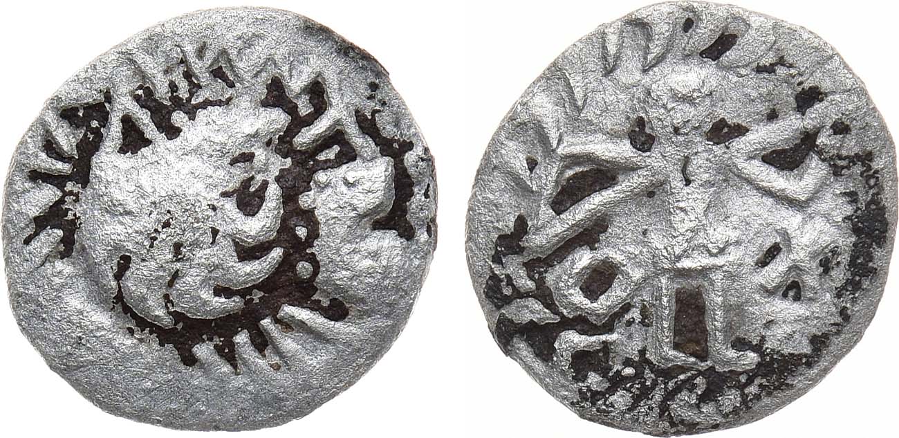 Серебро. 2,33г. Аверс: схематичное изображение головы вправо. Реверс: фигура воина с копьем. F.