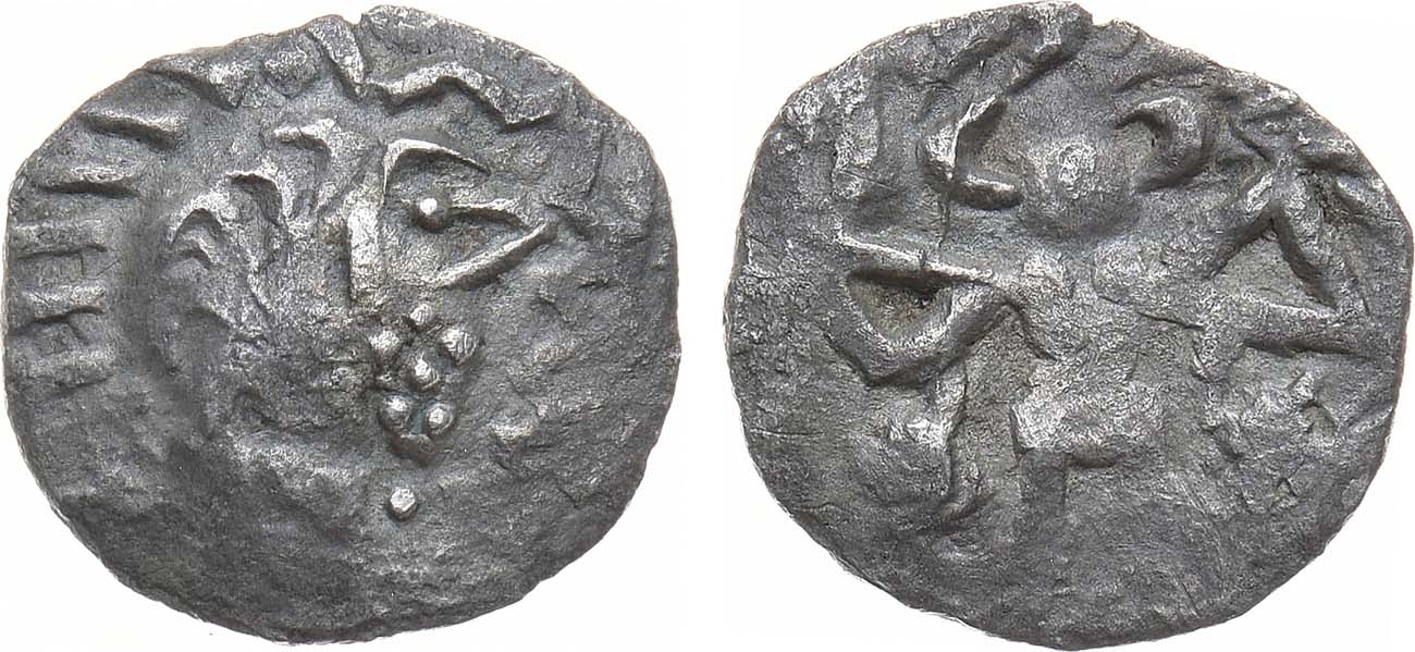 Серебро. 1,76г. Аверс: схематичное изображение головы вправо. Реверс: фигура воина с копьем. VF/XF.