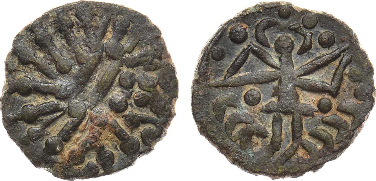 Медь. 2,23г. Аверс: розетка с двумя линиями и точками по сторонам; вокруг лучи с точками на концах. Реверс: фигура воина с "крыльями", вокруг точки, рядом с головой два полумесяца. Клещинов аверс - 444; реверс - не описан.. VF.