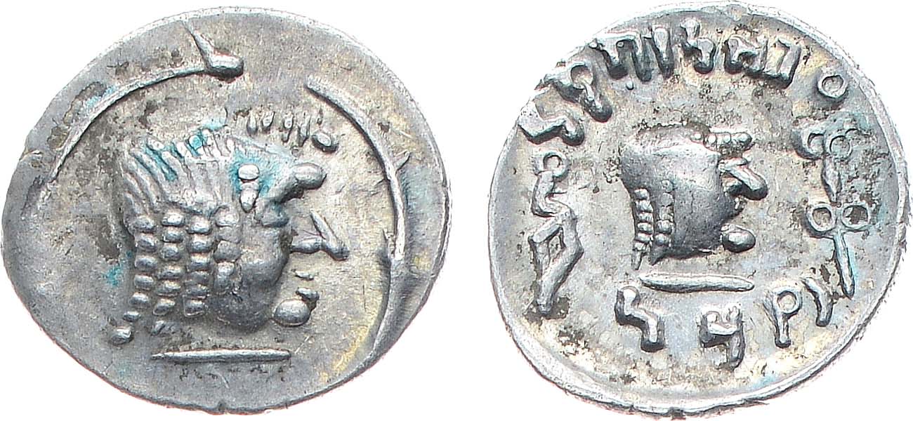 Серебро. 1,26г. Райдан. Аверс: голова мужчины вправо. Реверс: голова мужчины вправо со скипетром, монограммой и химьяритской легендой. AU.