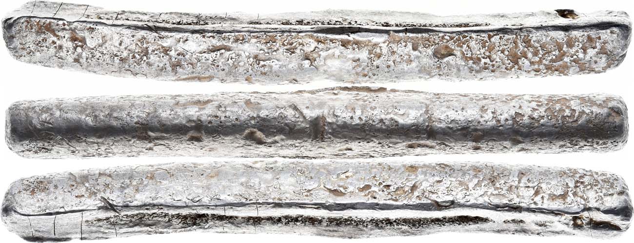 Серебро. 197,86г. Длина: 135,69 мм. Ширина: 13,40 мм (левый край), 13,36 мм (правый край), 16,15 мм (центр). Высота: 15,56 мм. Сверху слитка имеется характерная усадочная ложбинка. Сверху, начиная в 55 мм от правого края в сторону торца, нанесены 8 вертикальных нарезок, еще одна нарезка под углом 75 градусов расположена в 10 мм от левого торца. Отсутствие на боковой поверхности шва свидетельствует об отливке в один прием. Изготовлен между первой и третьей четвертями XIV в. Прокопов 9. AU.