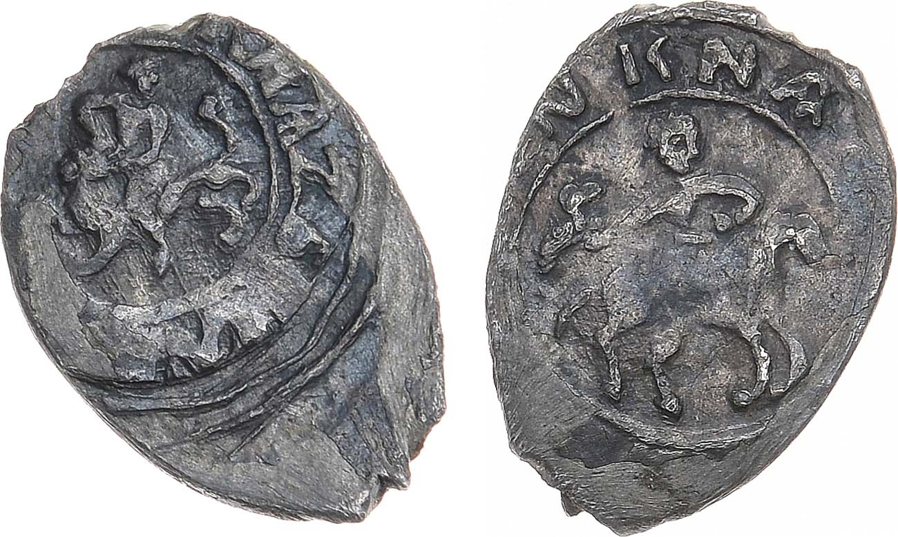 Серебро. 0,55г. Чеканка в Москве. Аверс: Самсон, борющийся со львом влево, круговая легенда "+КНѦZЬ ВЄЛНКНI ВАСИЛНI". Реверс: сокольник вправо, круговая легенда "КНѦZЬ ВЄЛНКИI ВАСНЛЄI". ГП2 1700A (R-VIII). AU/UNC.