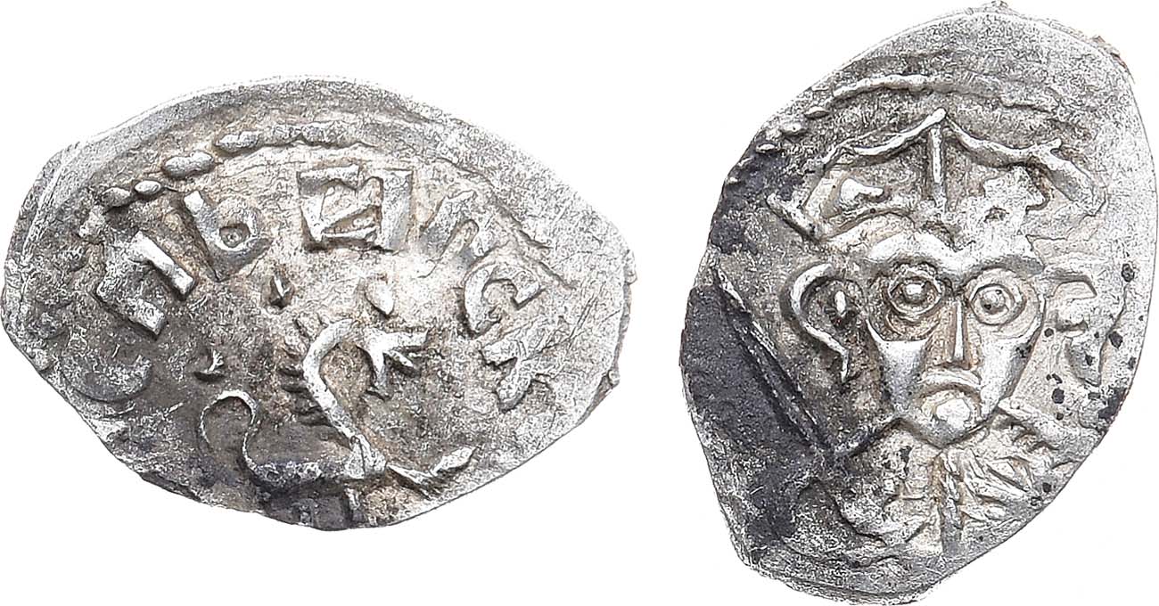 Серебро. 0,77г. Аверс: барс вправо, украшения в виде точек, круговая легенда. Реверс: князь Довмонт с мечом, литера "Л" справа, украшения в виде точек. подобна: ГП2 7645В (R-III). UNC.