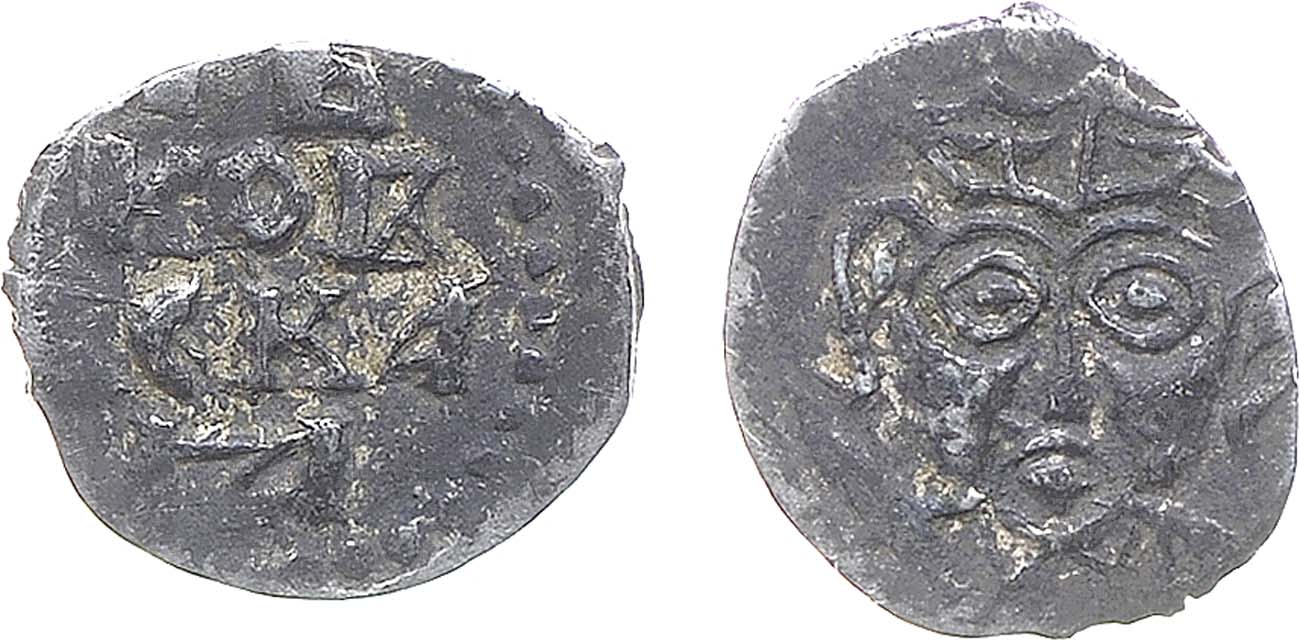 Серебро. 0,18г. Аверс: русская строчная легенда, украшения в виде точек. Реверс: Довмонт с мечом. ГП2 №7680 (R-V). UNC.