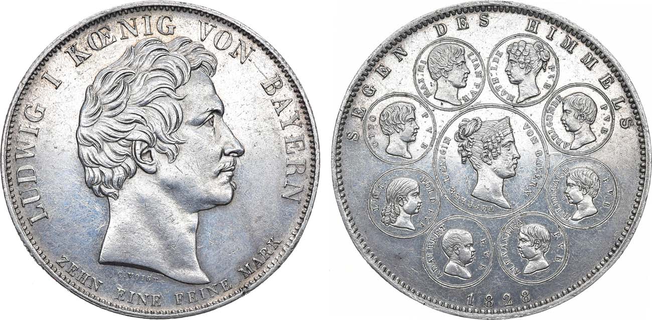Серебро. 28,09г. Мюнхен. В центре медальон с изображением жены короля, Терезы Баварской. По бокам восемь медальонов с детьми королевской пары — Максимилианом (будущим королём Баварии), Оттоном (будущим королём Греции), Луитпольдом (будущим принц-регентом Баварии), Адальбертом, Матильдой, Адельгундой, Хильдегардой и Александрой. KM 734. Davenport 563. AU.