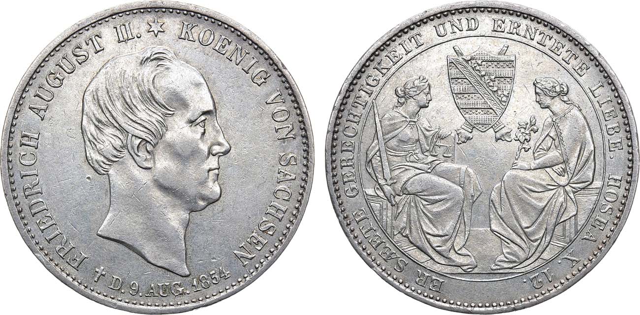 Серебро 750 пробы. 22,27г. Дрезден (F). Тираж 16000 экз. Отчеканена на смерть Короля Фридриха Августа II. KM 1180. AU.