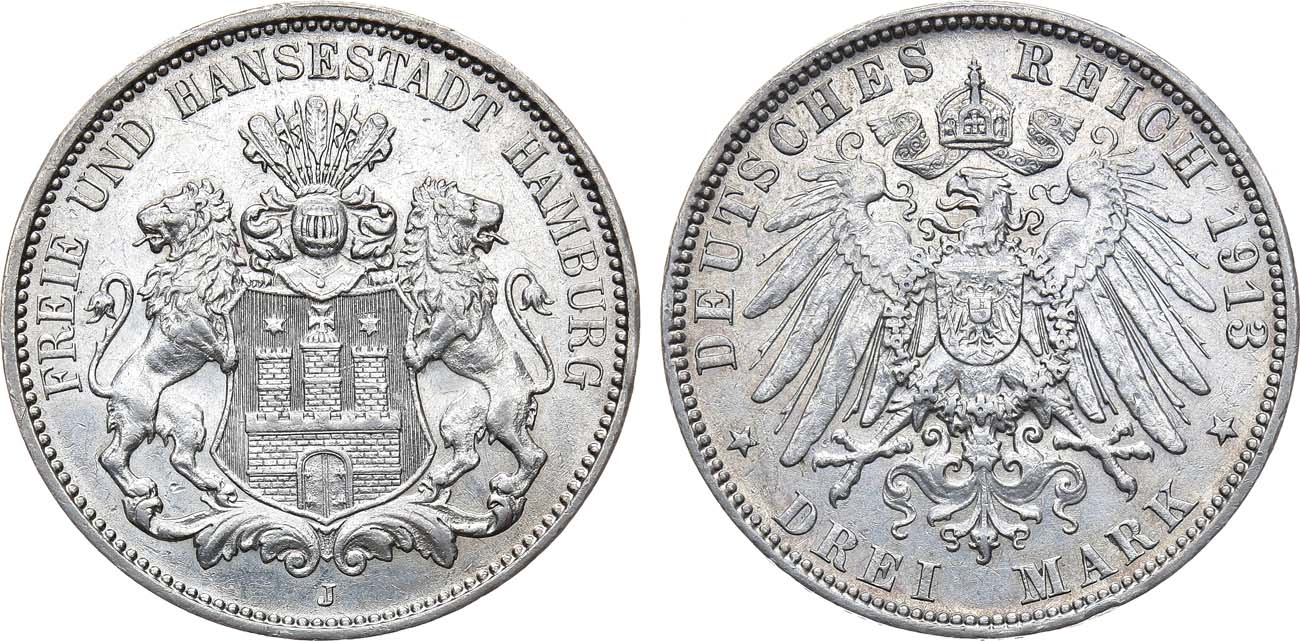 Серебро 900 пробы. 16,64г. Гамбург (J). Тираж 343.200 экз. KM 620. Jaeger 64. Weege 63.. AU.