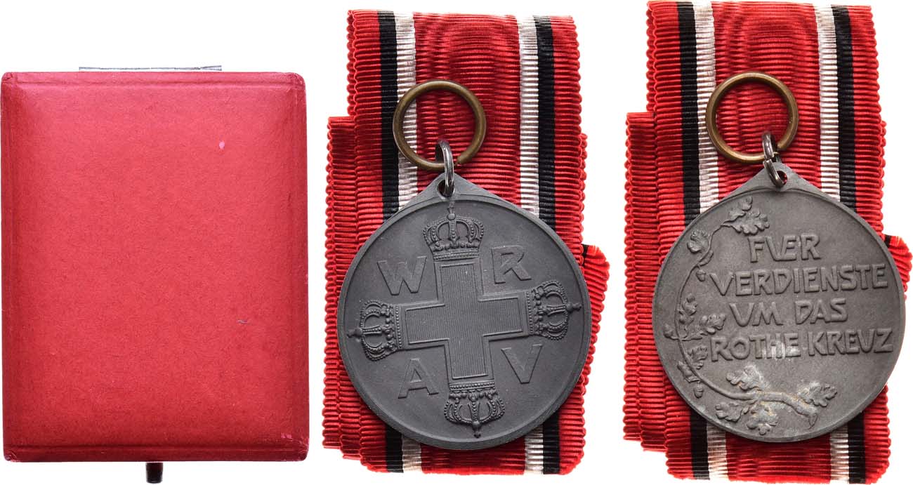 Цинк. 12,9г. Диаметр 34 мм. Аверс: крест увенчанный коронами, в углах лучей креста буквы "W / R / A / V" - "Wilhelm Rex, Auguste Viktoria". Реверс: надпись в четыре строки "FUER / VERDIENSTE / UM DAS / ROTHE KREUZ", слева от надписи дубовая ветвь. UNC.