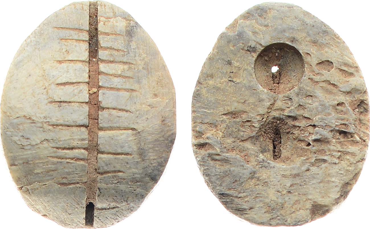 Кость. 2,34г. Размеры: длинна 22 мм, ширина 17 мм. Толщина 6 мм. Центральный Китай. Грубая стилизация. Быков-таблица 1-№3. Ch Opitz стр. 121.. VF.