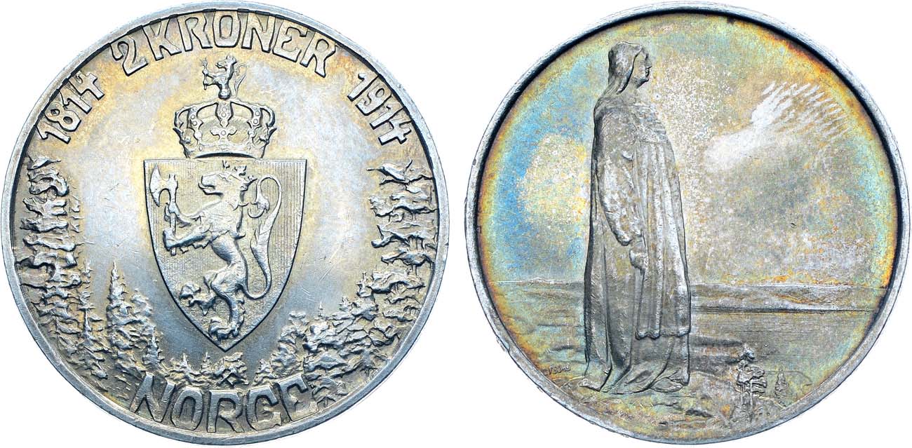 Серебро 800 пробы. 15г. Конгсберг. Отчеканена в память 100-летия Конституции Норвегии. Тираж 225600 экз. KM 377. UNC.