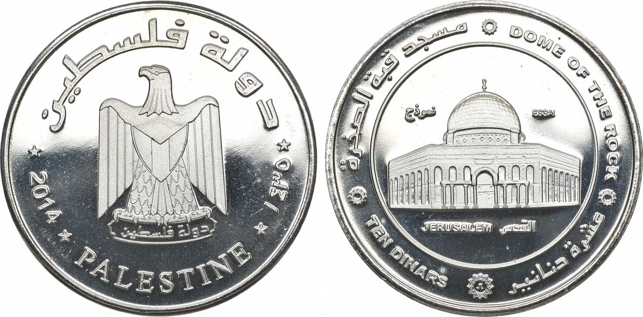 Медно-никелевый сплав, серебрение. 26,21г. Медальер Joseph E. Lang. "Государство Палестина" написано на арабском языке сверху. Эмблема Палестины в центре. По одной звезде с каждой стороны. «Essai» на арабском языке слева и на английском языке справа. "Palestine" написано ниже с датами с каждой стороны. BU.