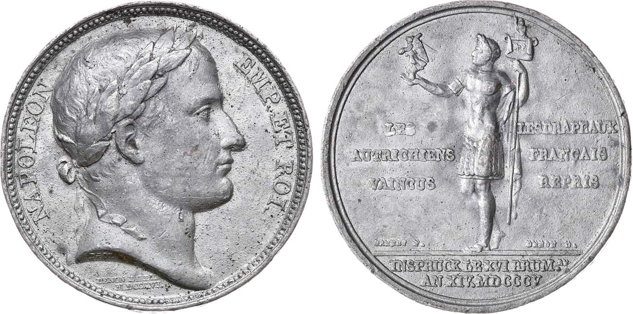 Свинцово-оловянный сплав. 34,27г. Диаметр 40 мм. Аверс: "NAPOLEON EMP. ET ROI.", в обрезе бюста "DROZ FEC", под обрезом в две строки "DENON DIR/ MDCCCV". Реверс: слева в поле в три строки "LES / AUTRICHIENS /VAINCUS", справа в поле в три строки "LES DRAPEAUX / FRANCAIS / REPRIS", под линией обреза в две строки "INSPRUCK LE XVI BRUM. RE / AN XIV. MDCCCV", слева над линией обреза "BRENET F.", справа "DENON D.". подобна Bramsen 442. XF.