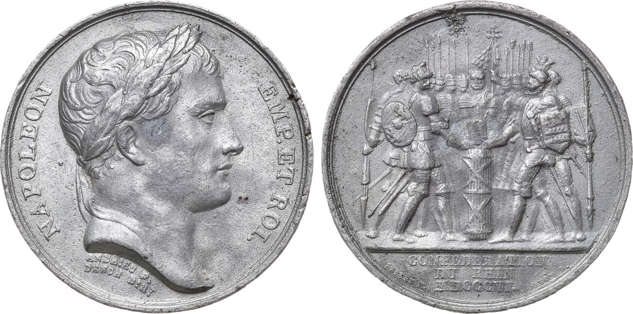 Свинцово-оловянный сплав. 35,1г. Диаметр 40 мм. Аверс: "NAPOLEON EMP. ET ROI.", под бюстом Императора в две строки "ANDRIEU F./ DENON DER. Реверс: под линией обреза, в три строки "CONFEDERATION/ DU RHIN/ MDCCCVI", слева по кругу "BRENET F", справа по кругу "DENON D.". подобна Bramsen 534. XF.