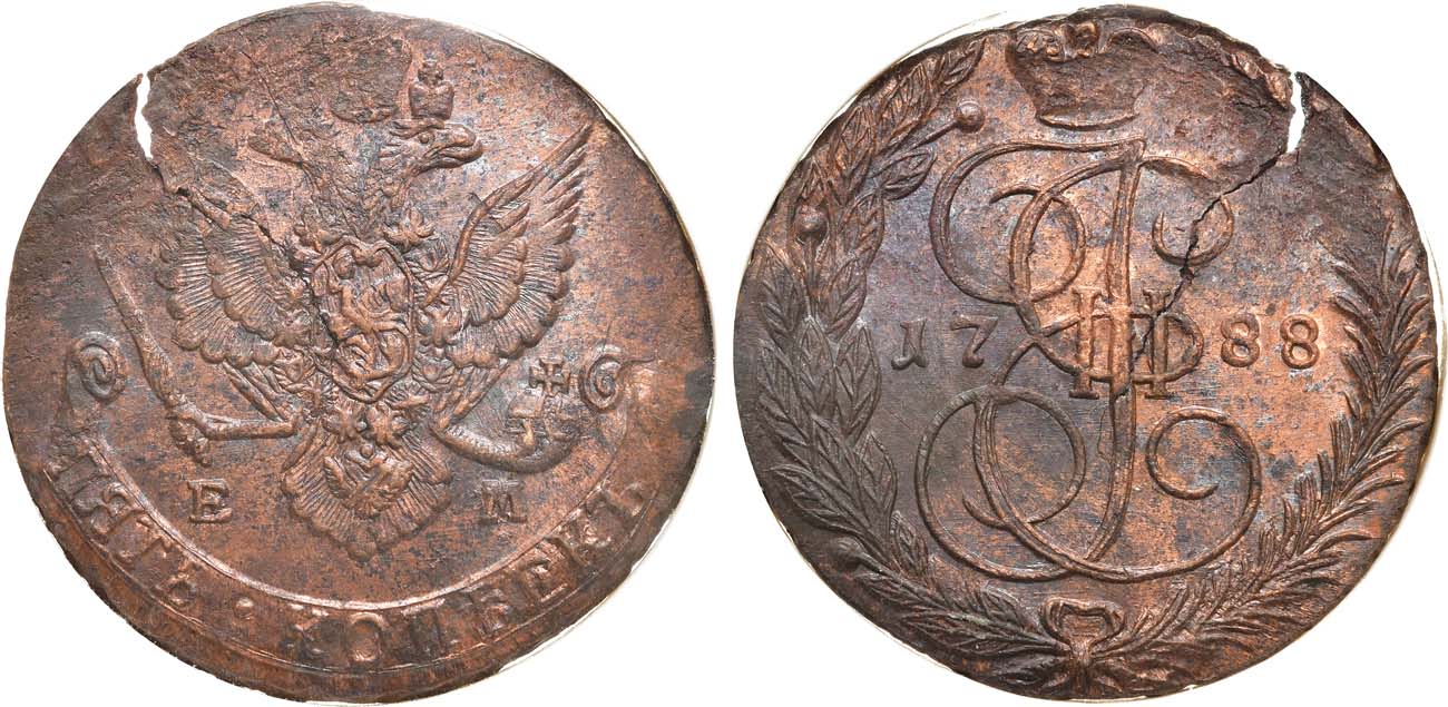 Медь. Аверс: орел образца 1780-1787 гг. Реверс: вензель и корона больше. Уздеников 2792(•). Биткин 640(R1). 3 рубля по Петрову. 5 рублей по Ильину. Дьяков 171, 596(R1). Brekke 121, 268(–). MS 61 RB.