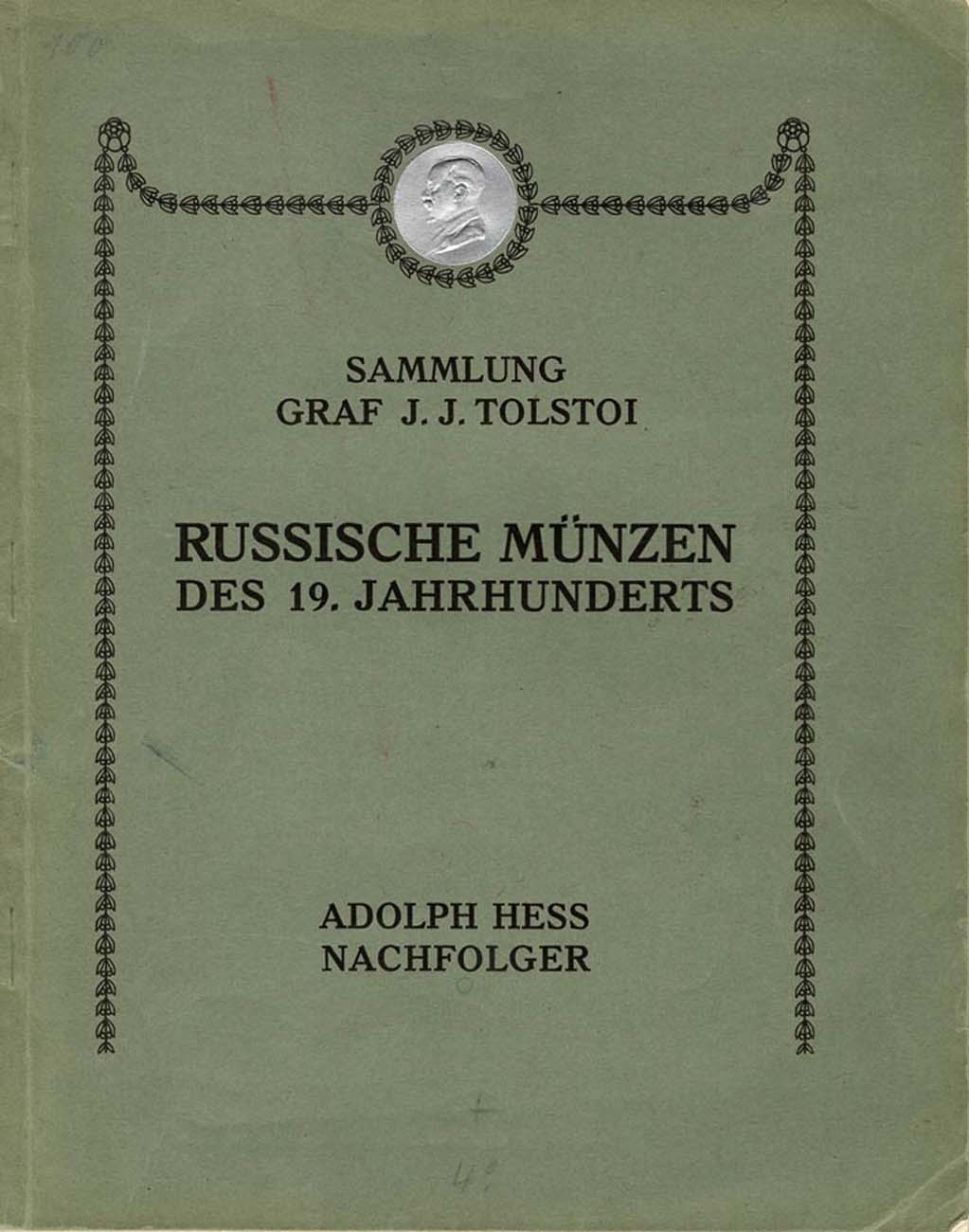 10 марта 1913 года. 3193 лота. 86 стр., без таблиц. Распродажа, вероятно, самой обширной и выдающейся коллекции монет XIX века известного русского государственного деятеля, археолога и нумизмата графа Ивана Ивановича Толстого (1858-1916 гг). По мнению многих, его коллекция превосходила собрание монет Императорского Эрмитажа. Эту коллекцию активно использовал Великий Князь Георгий Михайлович при составлении своего "Корпуса русских монет".