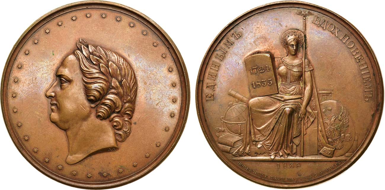 Бронза. 114,6г. Диаметр 62 мм. Санкт-Петербургский монетный двор. Медальер А.П. Лялин, реверс по рисунку графа Ф.П. Толстого. Аверс: на обрезе "АЛ". Реверс: внизу у окружности "ПО РИСУНКУ Г. ТОЛСТАГО РѢЗАЛ А ЛЯЛИН. 1837." Гурт: клеймо "326." Смирнов 493. Дьяков 542.1(R0). AU.