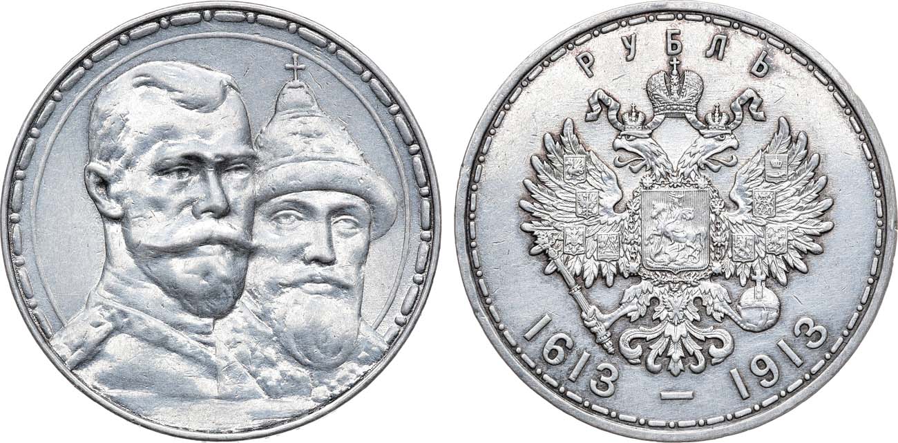 Серебро. 20,01г. Чеканен в память 300-летия Дома Романовых. Аверс: выпуклый чекан. Уздеников 4194. Биткин 336. Казаков 454. AU.