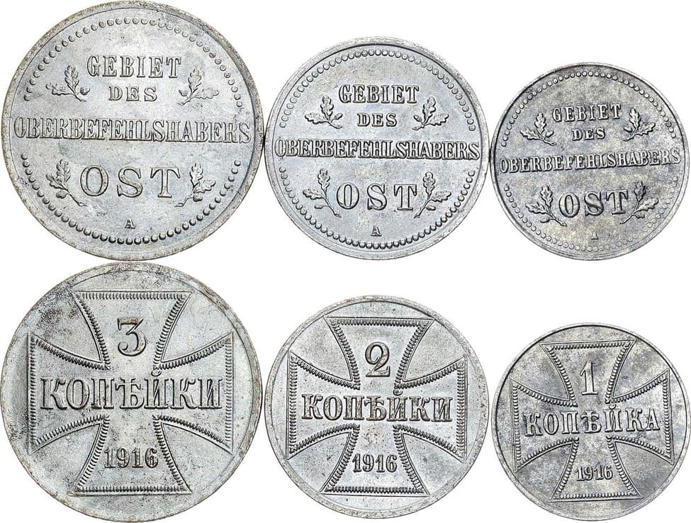 Железо. 1 копейка 1916 года. Бона германской оккупации. (А) Берлин. Железо. 2,85 г. Уздеников 4948. Биткин 6. UNC. 2 копейки 1916 года. Бона германской оккупации. (А) Берлин. Железо. 5,67 г. Уздеников 4946. Биткин 4. UNC. 3 копейки 1916 года. Бона германской оккупации. (А) Берлин. Железо. 8,56 г. Уздеников 4944. Биткин 1. UNC. UNC.