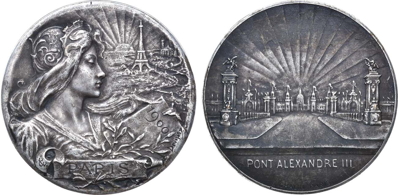 Бронза, серебрение. 54,09г. Диаметр 52 мм. Медальер Л. Шален (на реверсе, на шесть часов: "L. CHALIN PARIS"). Внизу на гурте выбито: "BRONZE". AU.