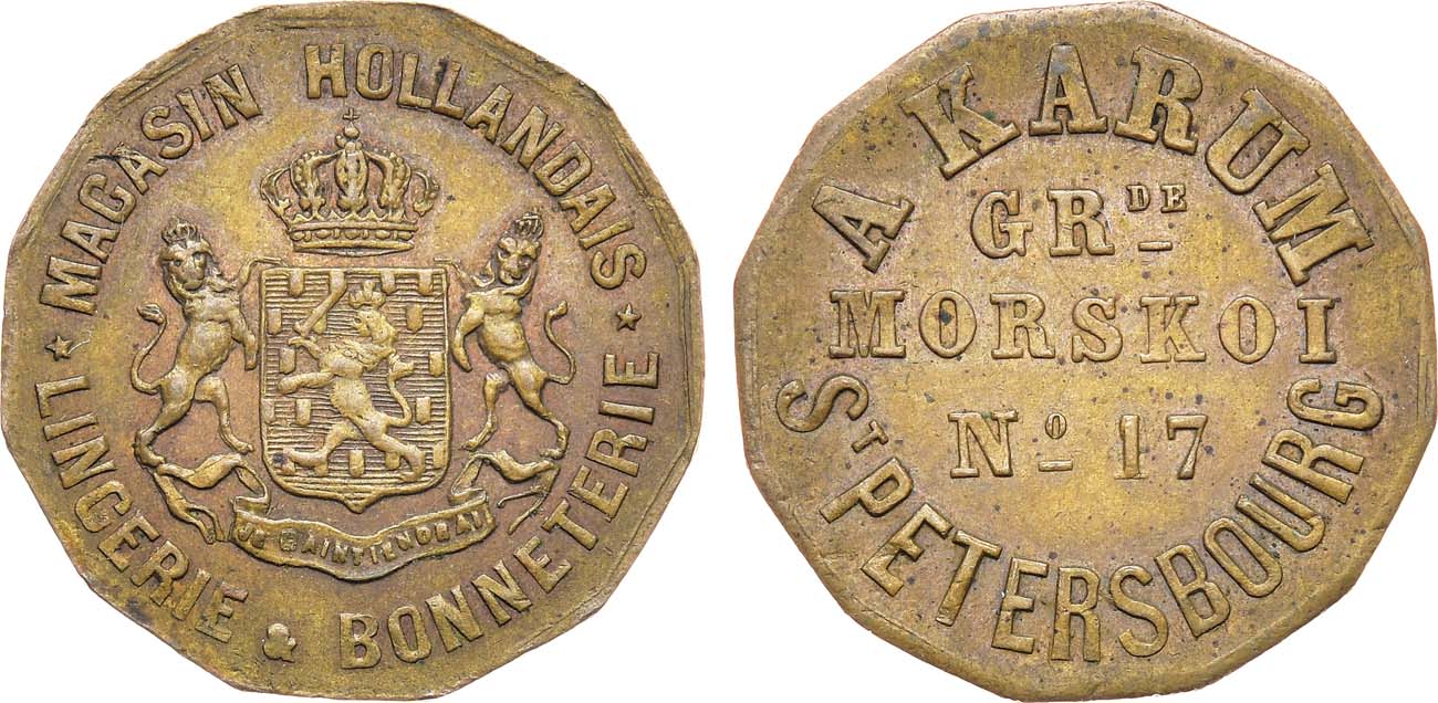 Латунь. 4,92г. Размеры 25х25 мм. Российская империя, Санкт-Петербург, конец XIX в. Тункель 410. XF/AU.