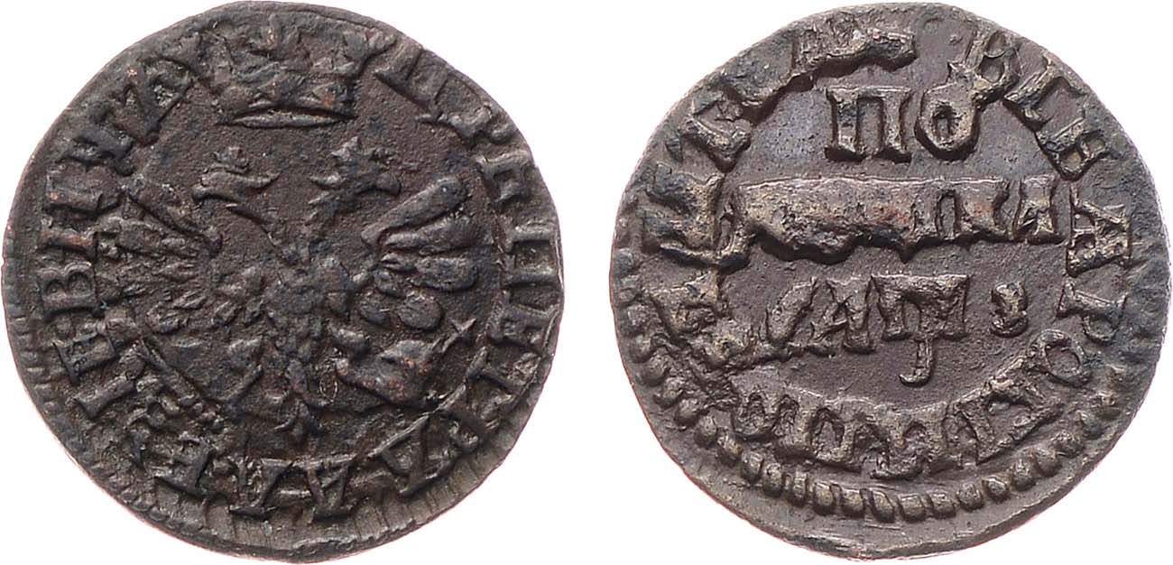Медь. 1,83г. Кадашевский монетный двор. Реверс: "ПОВЕЛИТЕЛЬ". Уздеников 2290. Биткин подобна 3619. Дьяков подобна 194, 2646(R0). Brekke 26, 31(•). XF/AU.