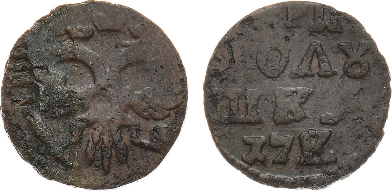 Медь. 0,97г. Кадашевский монетный двор. Реверс: дата буквами и арабскими цифрами "17К". Уздеников 2425(–). Биткин 3701(R1). 1 рубль по Ильину. Дьяков 195, 4043(R1). Brekke 27, 71(–). XF.