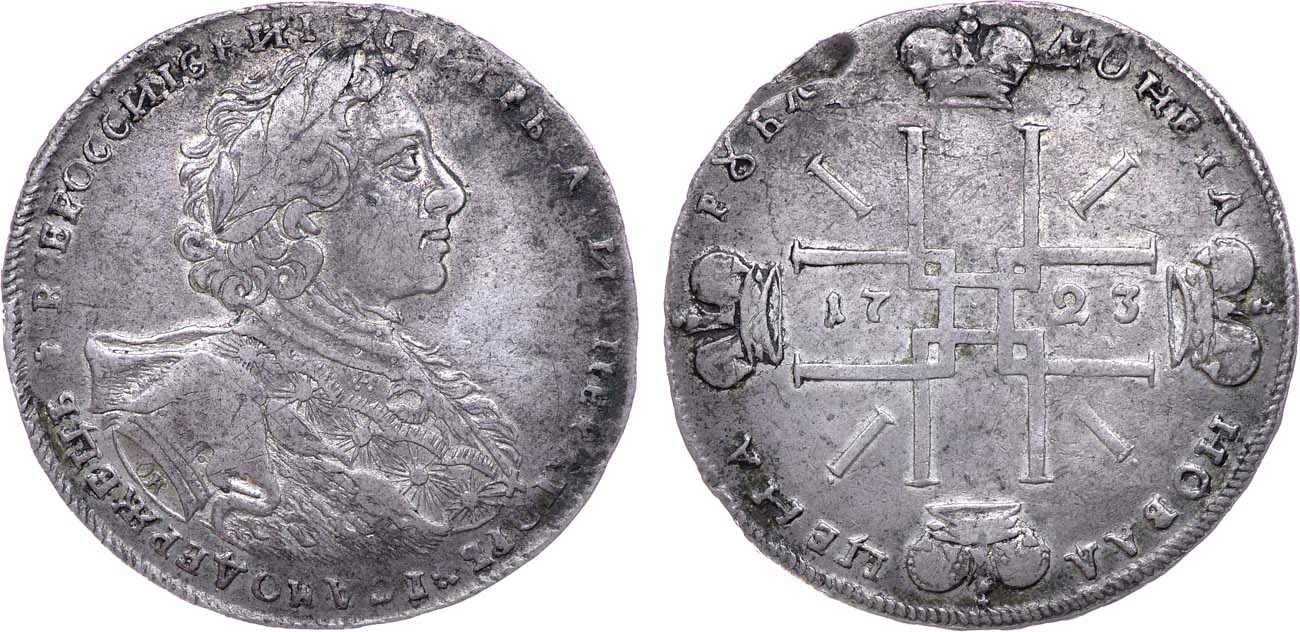 Серебро. 27,22г. Красный монетный двор. Аверс: тип 1723 г. "Бюст в горностаевой мантии". Малый крест на груди императора, розетка над головой, розетки и точки делят круговую надпись. Уздеников 0607. Биткин 882. 3 рубля 50 копеек по Петрову. Дьяков 263, 1300(R1). XF.