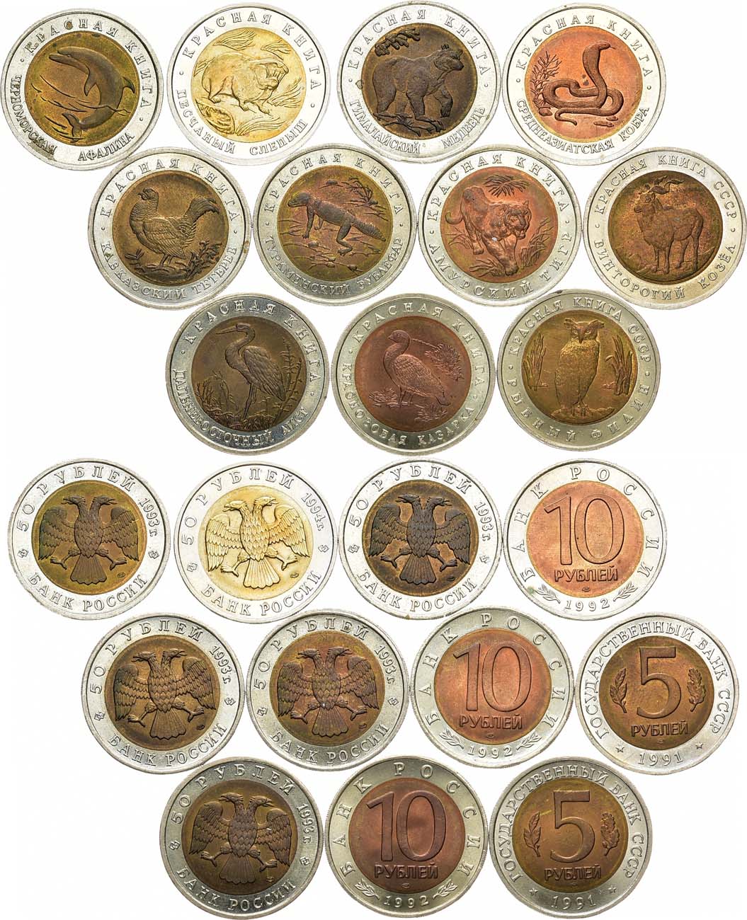 Биметалл. 50 рублей 1994 года. ЛМД. Песчаный слепыш. 50 рублей 1993 года. ЛМД. Гималайский медведь. 50 рублей 1993 года. ЛМД. Черноморская Афалина. 50 рублей 1993 года. ЛМД. Туркменский Эублефар. 50 рублей 1993 года. ЛМД. Кавказский Тетерев. 50 рублей 1993 года. ЛМД. Дальневосточный Аист. 10 рублей 1992 года. ЛМД. Среднеазиатская Кобра. 10 рублей 1992 года. ЛМД. Амурский Тигр. 10 рублей 1992 года. ЛМД. Краснозобая Казарка. 5 рублей 1991 года. ЛМД. Рыбный Филин. 5 рублей 1991 года. ЛМД. Винторогий Козёл. UNC.