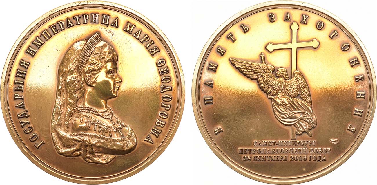 Прах императрицы Марии Федоровны — матери императора Николая II — 28 сентября 2006 года был захоронен в Петропавловском соборе Санкт-Петербурга, в усыпальнице членов семьи Дома Романовых. По случаю церемонии на СПМД были изготовлены памятные медали и жетоны. Это — дань традиции: до 1917 года кончины монархов и их погребения в родовой усыпальнице всегда отмечались выпуском памятных медалей. Из Краснодарской коллекции монет и медалей.