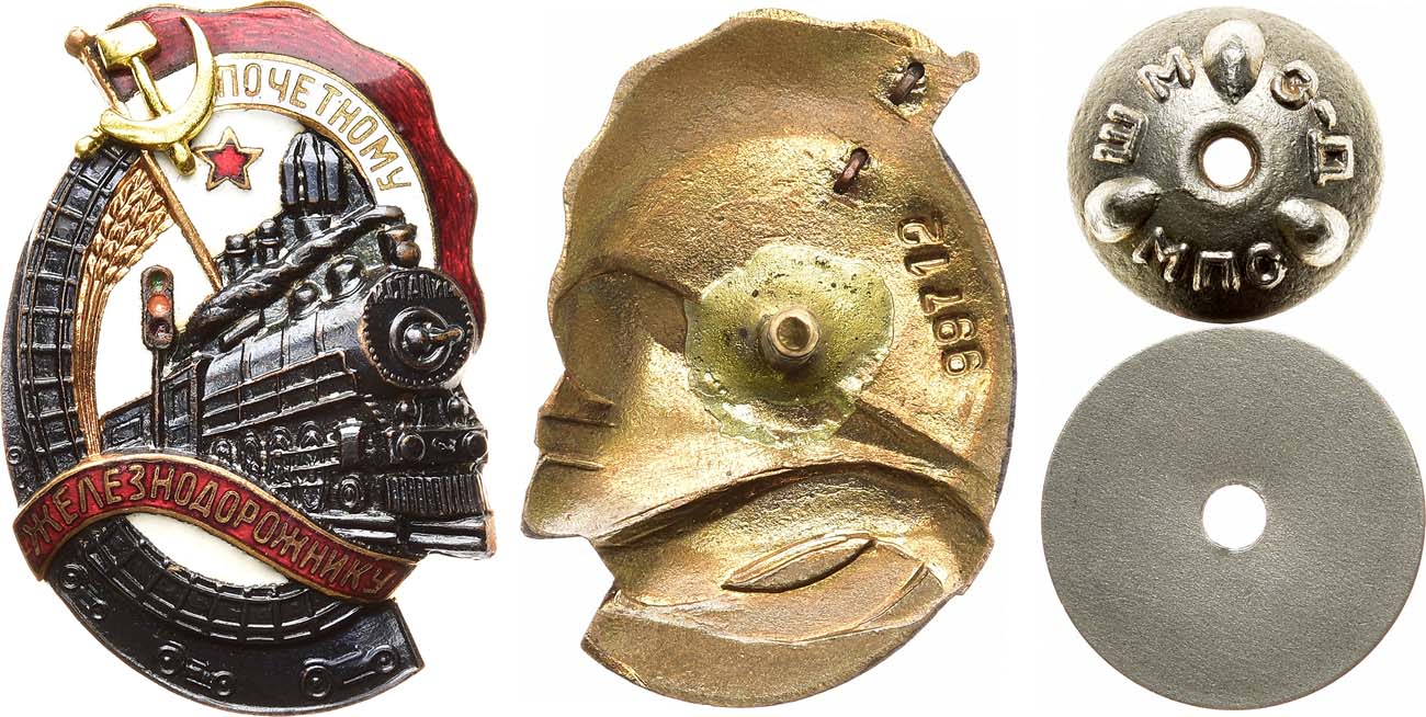 Бронза, серебрение, позолота, эмаль. 17,85г. Размеры 45,2х31,5 мм. СССР, Москва, 1947 г. Штампо-механический завод МПС. На закрутке по окружности надписи: «Ш.М. – З–Д. – М.П.С.». AU/UNC.
