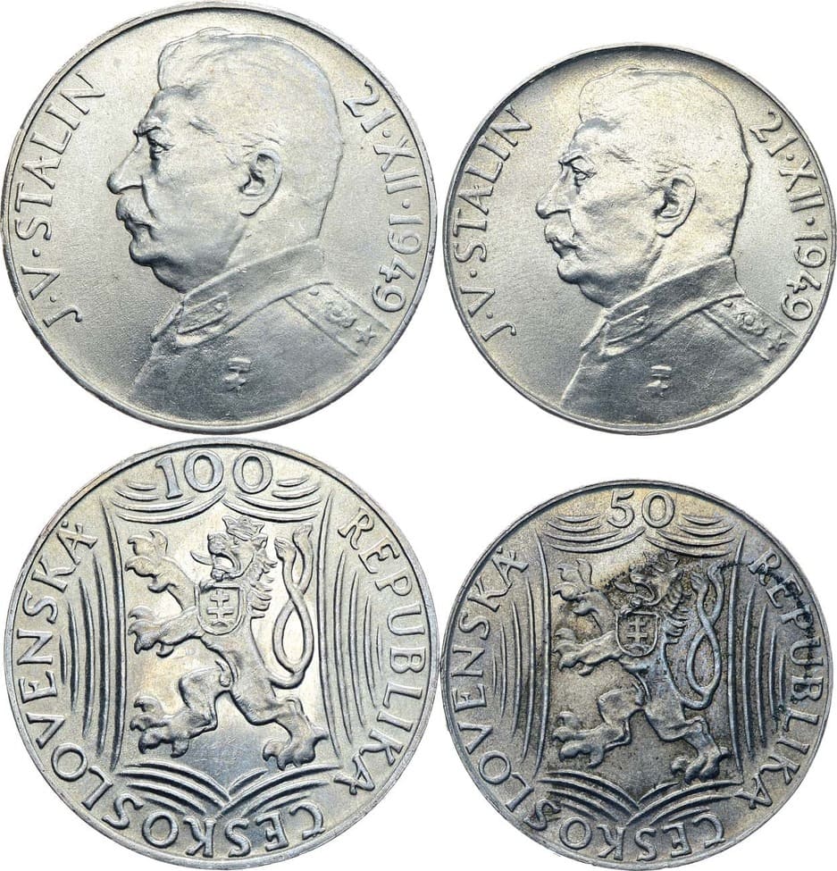 Серебро. Чехословакия. 100 крон 1949 года. Серебро. 14,09 г. Кремница. 70 лет со дня рождения Иосифа Сталина. KM 30. UNC. Чехословакия. 50 крон 1949 года. Серебро. 10,05 г. Кремница. 70 лет со дня рождения Иосифа Сталина. KM 28. UNC. UNC.