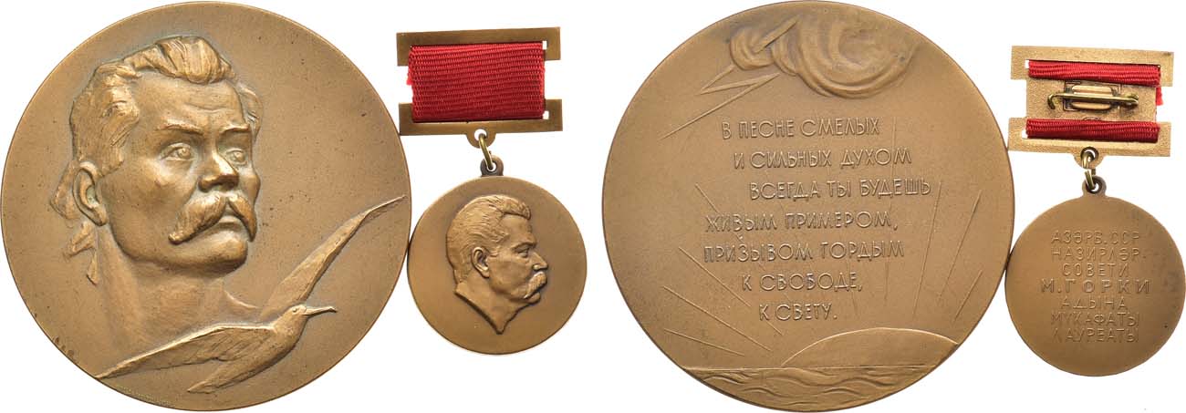 Медаль 1961 года. В память 25-летия со дня смерти М. Горького. Томпак. 121,78 г. Диаметр 65 мм. Ленинградский монетный двор. Медальер В.М. Акимушкина (на аверсе слева внизу у окружности: "В.М.АКИМУШКИНА"). Тираж: 681 экз. UNC. Знак лауреату премии имени М. Горького от Совета министров Азербайджанской ССР. Томпак. 17,40 г. Диаметр 28,3 мм. СССР, неизвестное производство. UNC. Шкурко, Салыков 222. UNC.