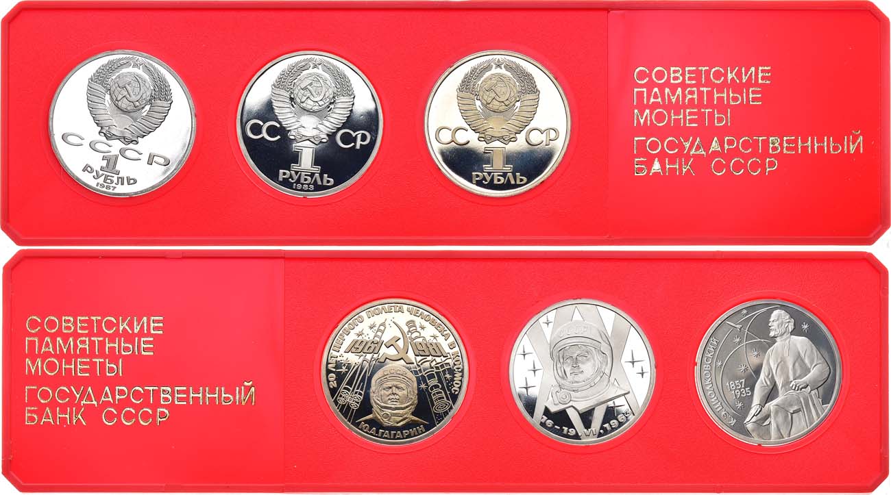 Медно-никелевый сплав. 1 рубль 1981 года. ЛМД. 20-летие первого полёта человека в космос - гражданина СССР Ю.А. Гагарина. Стародел. Широков. Сорокин. Золотарёв 12.1(П). PROOF. 1 рубль 1983 года. ЛМД. 20-летие первого полёта в космос женщины - гражданки СССР В.В. Терешковой. Стародел. Широков. Сорокин. Золотарёв 16.2(П). PROOF. 1 рубль 1987 года. ЛМД. 130 лет со дня рождения основоположника отечественной космонавтики К.Э. Циолковского. Стародел. Широков. Сорокин. Золотарёв 28.2. PROOF. PROOF.