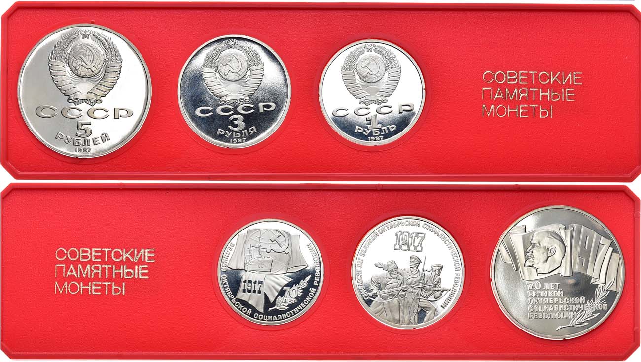 Медно-никелевый сплав. 1 рубль 1987 года. ЛМД. 70 лет ВОСР. Широков. Сорокин. Золотарёв 29.1 П. PROOF. 3 рубля 1987 года. ЛМД. 70 лет ВОСР. Широков. Сорокин. Золотарёв 29.6 П. PROOF. 5 рублей 1987 года. ЛМД. 70 лет ВОСР. Широков. Сорокин. Золотарёв 29.7 П. PROOF. PROOF.
