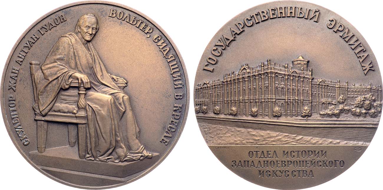 *В каталоге медаль описана в алюминие. «Вольтер, сидящий в кресле» — лучший, наиболее яркий и законченный образ из всех созданных Гудоном портретов философа. Мраморная статуя восьмидесятичетырехлетнего Вольтера был приобретен Екатериной II у автора в 1784 году. Вольтер позировал скульптору незадолго до своей кончины, будучи глубоким старцем, но мастер сумел передать внутреннюю энергию и острый динамичный характер "властителя дум" XVIII в.