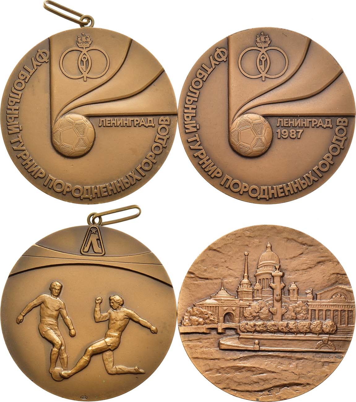 Призовая медаль 1987 года. Медаль за третье место Футбольного турнира породненных городов. Томпак. 129,65 г. Диаметр 60 мм. Ленинградский монетный двор. Без подписи медальера. С ушком и соединительным кольцом. UNC. Медаль 1987 года. В память проведения Футбольного турнира породненных городов. Томпак. 128,29 г. Диаметр 60 мм. Ленинградский монетный двор. Медальер А.В. Бакланов (на реверсе на 4 часа "А. БАКЛАНОВ"). UNC. UNC.