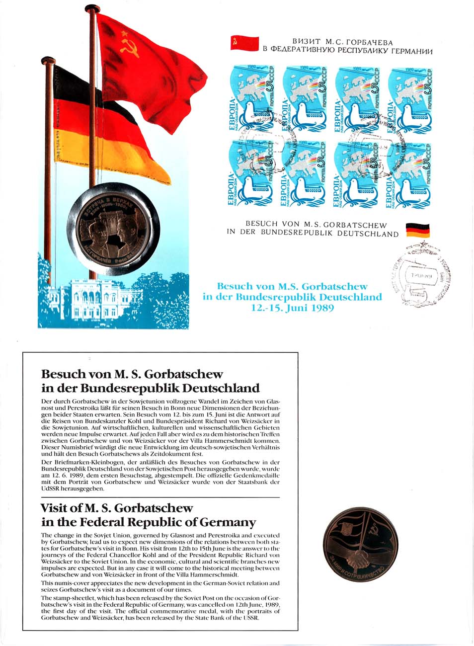 Медаль вложена в конверт с 8 марками по 5 копеек со спецгашением.
