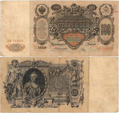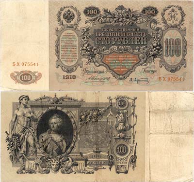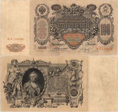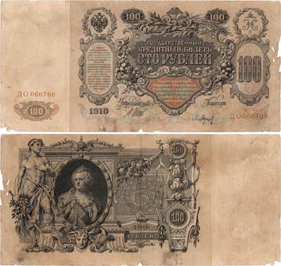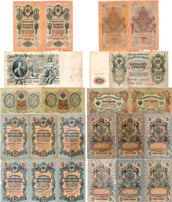 3 рубля 1905 года. Серия ФЛ 439109. Управляющий Шипов, Кассир Гр. Иванов. VF. 3 рубля 1905 года. Серия АЕ 142407. Управляющий Шипов, Кассир А. Афанасьев. VF. 5 рублей 1909 года. Серия ВЗ 130435. Управляющий Коншин, Кассир Гр. Иванов. VF. 5 рублей 1909 года. Серия ИИ 603083. Управляющий Шипов, Кассир Чихиржин. VF. 5 рублей 1909 года. Серия УА-051. Управляющий Шипов, Кассир Чихиржин. VF/XF. 5 рублей 1909 года. Серия УА-074. Управляющий Шипов, Кассир Овчинников. VF. 5 рублей 1909 года. Серия УА-113. Управляющий Шипов, Кассир Овчинников. VF. 5 рублей 1909 года. Серия УБ-419. Управляющий Шипов, Кассир Федулеев. F. 10 рублей 1909 года. Серия ДЗ 520614. Управляющий Коншин, Кассир Морозов. VF. 10 рублей 1909 года. Серия ТЛ 674413. Управляющий Шипов, Кассир Иванов. F. 500 рублей 1912 года. Серия АД 176872. Управляющий Коншин, Кассир Морозов. VF. F/XF.