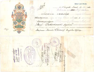Вексель на 900 рублей на гербовой бумаге 1909 года (цена 1 рубль 35 копеек), выданный Екатеринбургским товариществом "Братьев Макаровых" 11 июня 1912 года, Глазовскому купцу Михаилу Матвеевичу Столбову. Размер 124х335 мм. Реверс: три синие печати. 9 октября 1912 года опротестован Екатеринбургским нотариусом Бильновичем реестр №3927, 10 октября 1912 года, акт о протесте №328, 23 ноября 1912 года вынесено постановление-решение Уездного членского Вятчкого окружного суда №262. XF.