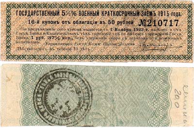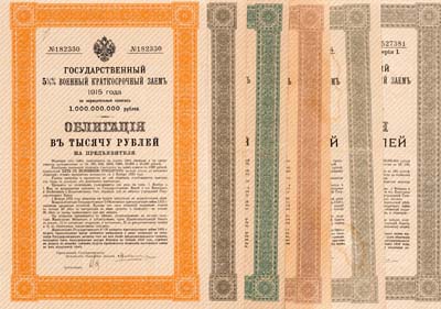 Государственный 5 1/2 % военный краткосрочный заем 1915 года в 1000 рублей на предъявителя, №182330, с 9 купонами. AU. Государственный 5 1/2 % военный краткосрочный заем 1915 года в 500 рублей на предъявителя, №172941, с 12 купонами. AU. Государственный 5 1/2 % военный краткосрочный заем 1915 года в 100 рублей на предъявителя, №214744, с 12 купонами. XF/AU. Государственный 5 1/2 % военный краткосрочный заем 1916 года в 100 рублей на предъявителя, №527381, Серия I, с 13 купонами. AU/UNC. Государственный 5 1/2 % военный краткосрочный заем 1916 года в 50 рублей на предъявителя, №001033, Серия II, с 10 купонами. AU/UNC. Государственный 5 1/2 % военный краткосрочный заем 1916 года в 100 рублей на предъявителя, №163225, Серия II, с 14 купонами. AU/UNC. XF/UNC.