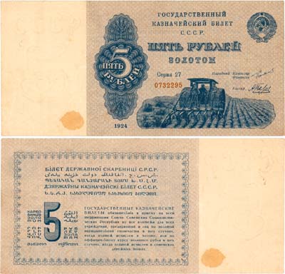 СССР. Государственный Казначейский билет. 5 рублей золотом 1924 года. Трактор.