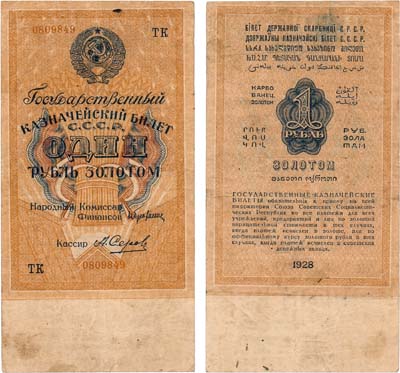 СССР. Государственный Казначейский Билет. 1 рубль золотом 1928 года.