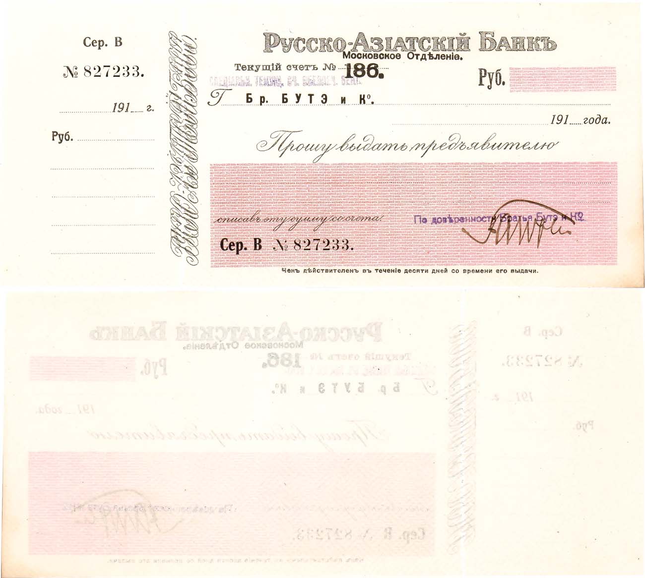 Синяя надпечатка "СПЕЦИАЛЬН. ТЕКУЩ. СЧ. ОБЕЗПЕЧ. ВЕКС.". С корешком. Серия В. №827233. UNC.