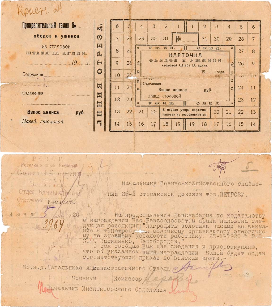 Синий штемпель IX армии (июня 5 дня 1920 года) №3964, слева вверху, с рукописной резолюцией, рукописные подписи. Основной текст отпечатан на печатной машинке. Предоставление о награждении т. Петрова, отличного организатора, энергичного, не знающего усталости работника золотыми часами. VF-.