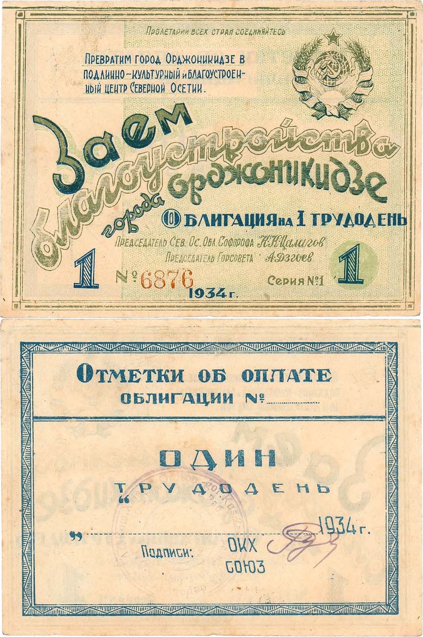 Орджоникидзе. Заем благоустройства города Орджоникидзе. Облигация на 1 трудодень. 1934 года.