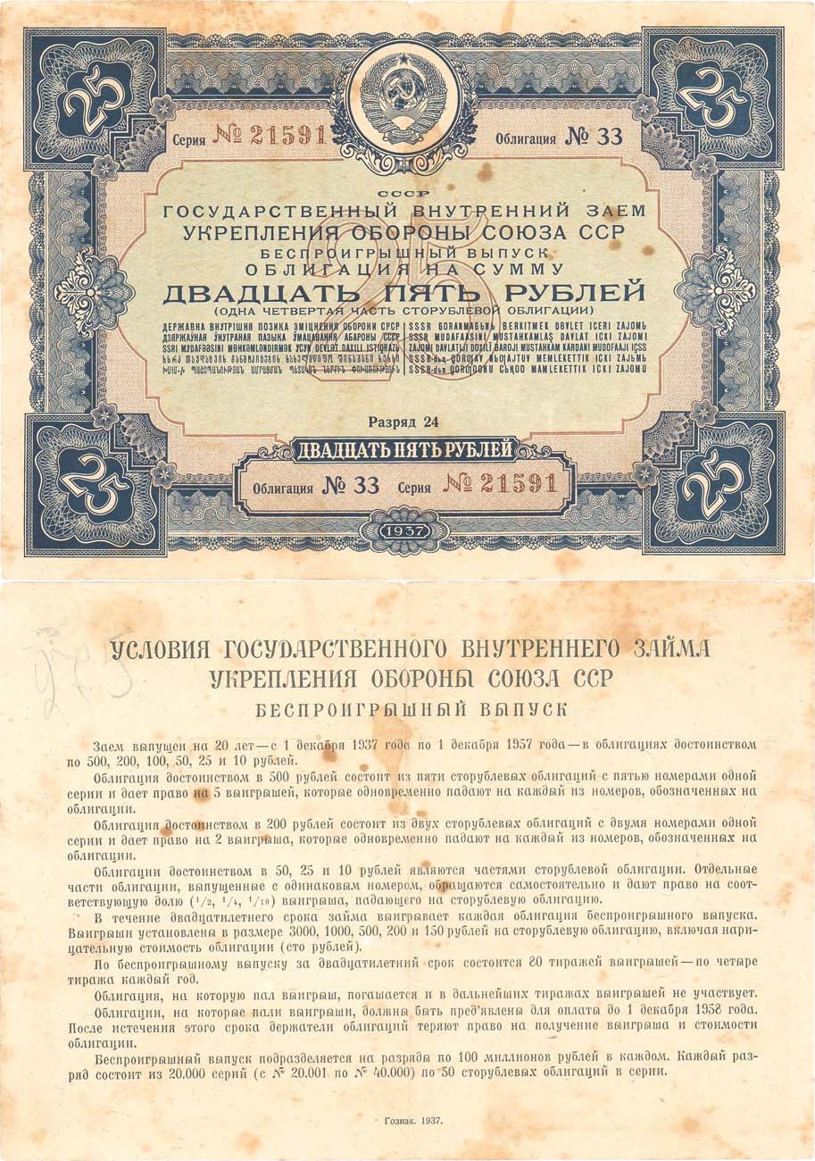 СССР. Государственный внутренний заем укрепления обороны Союза ССР. 1937 год. Беспроигрышный выпуск. Облигация на сумму 25 рублей (одна четвертая часть сторублевой облигации).